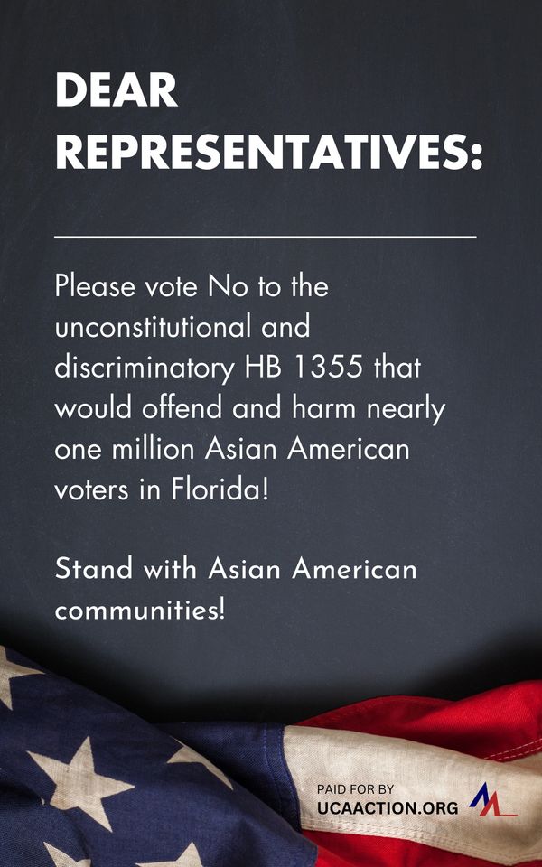 Please vote No to the unconstitutional and discriminatory HB 1355 that will offend and harm nearly one million Asian American voters in Florida! Stand with Asian American communities!