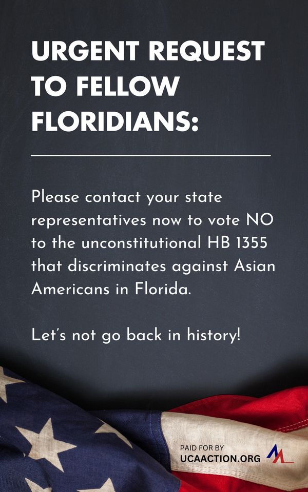Urgent request to fellow Floridians: Please contact your state representatives now to vote NO to the unconstitutional HB 1355 that discriminates against Asian Americans in Florida. Let’s not go back in history!